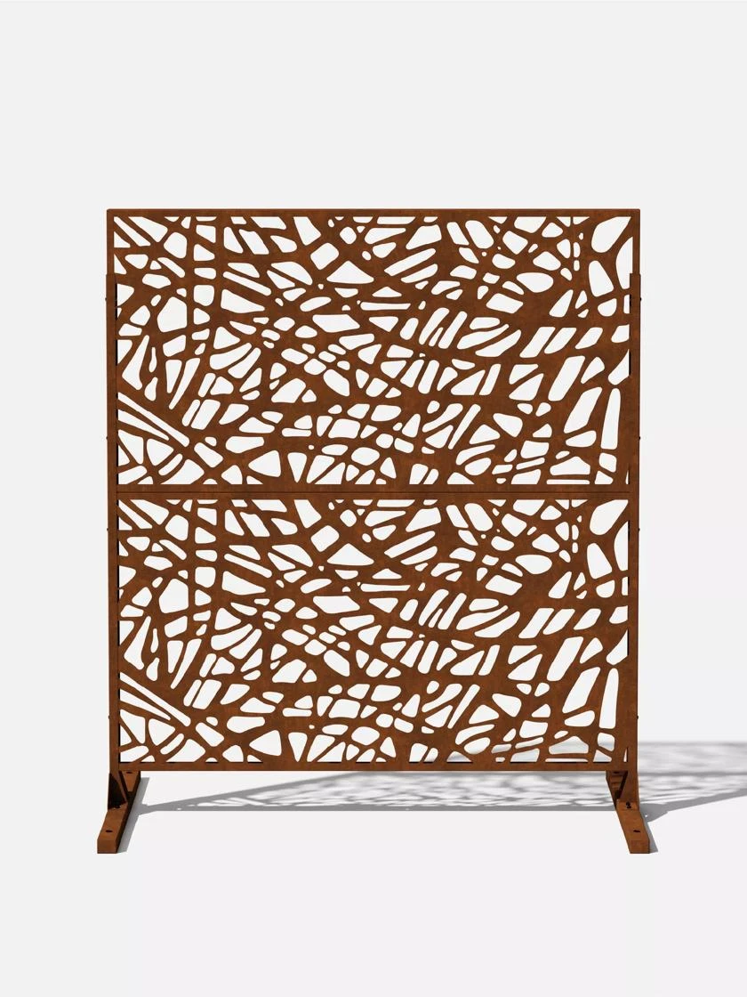 Privacy has never looked so good! Transform your backyard or deck with an outdoor two-panel privacy screen set. The abstract web design of this panel provides 65% privacy. Use it to hide an unsightly view, to block unwanted direct sunlight, create privacy or to frame an outdoor room. This screen is made from 1-1/2 mm laser cut steel designed to resist corrosion through all seasons. Solid, yet lightweight, the black galvanized steel screen is protected by a strong, scratch-resistant powder coating that is treated with UV inhibitors to minimize fading. The Corten steel screens are shipped in their raw steel state, gradually developing a rich rust patina finish over time.
